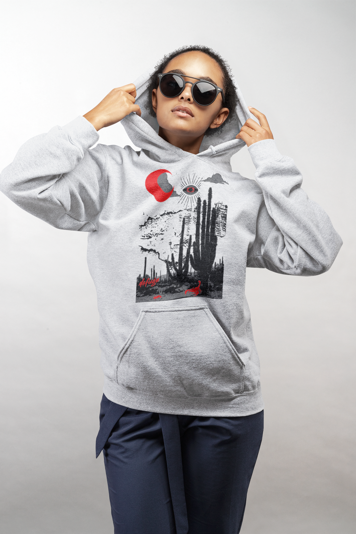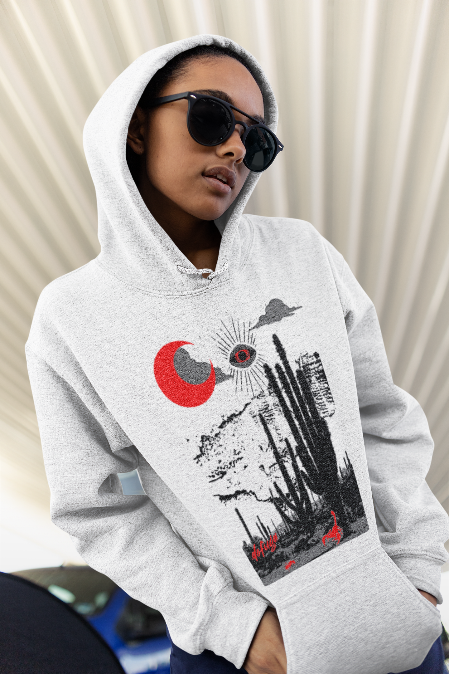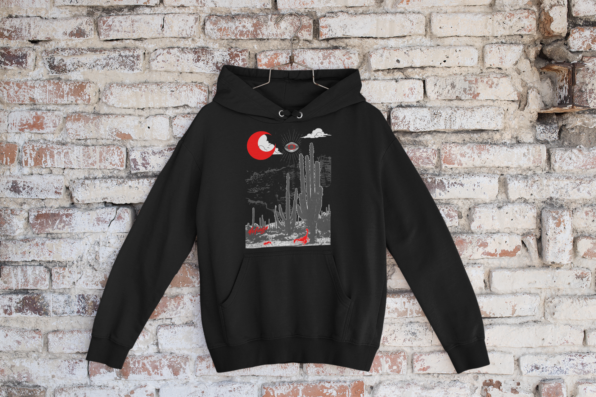 Show off your unique style with our Desert Standoff Hoodie! Made from 100% Ringspun cotton, this soft style hoodie features a handmade print from our Defuga collection. A mystique desert standoff between an ant and a scorpion is captured in this black magic design. Don't settle for basic, stand out with our Desert Standoff Hoodie.