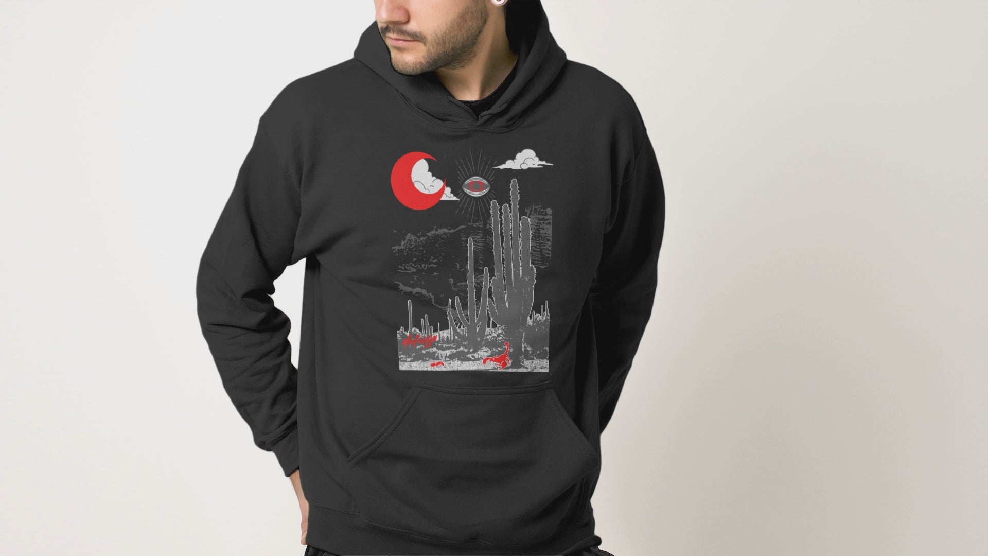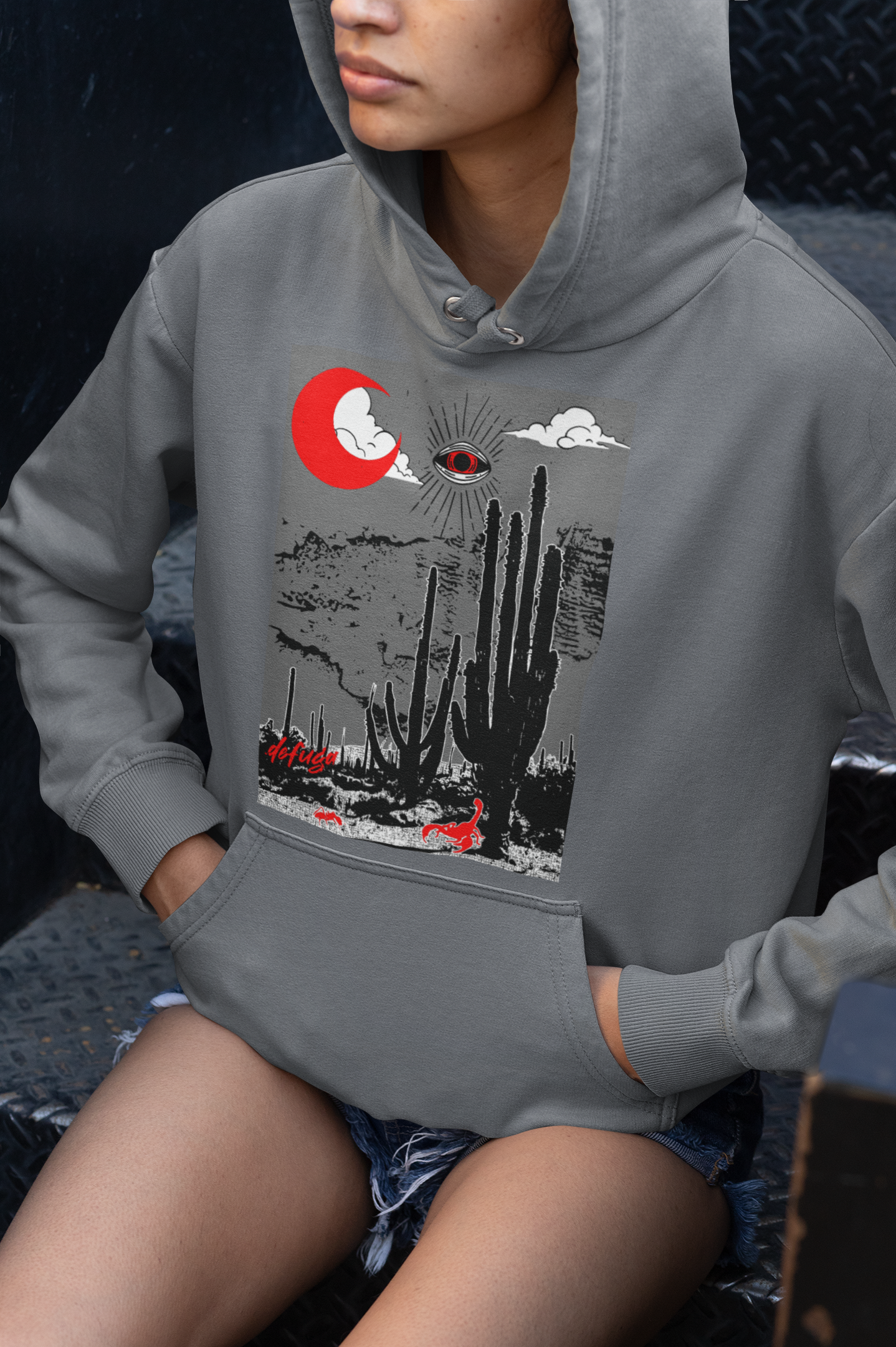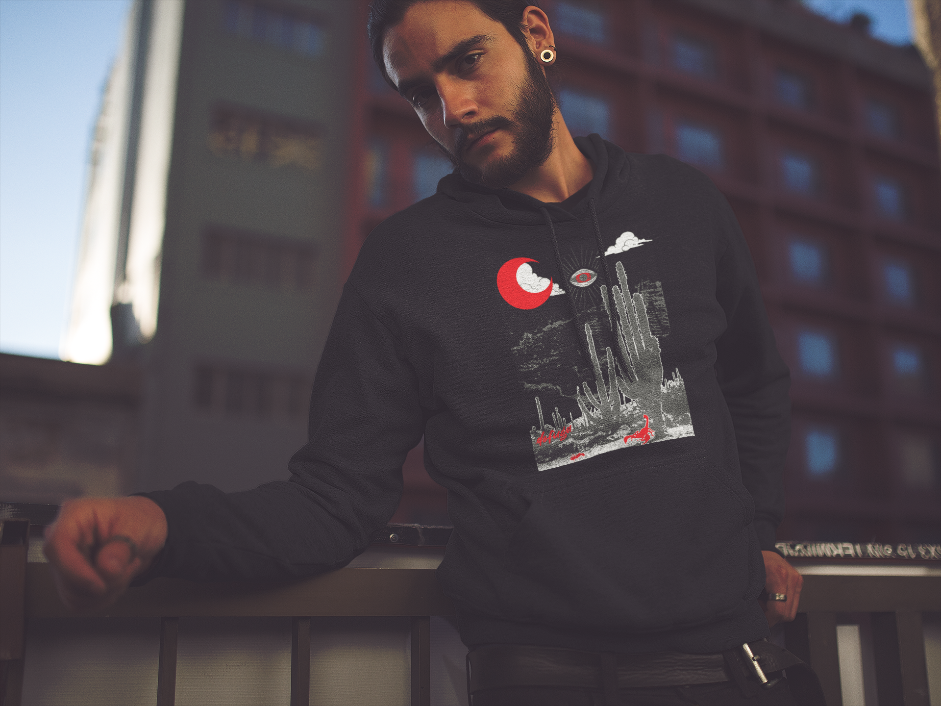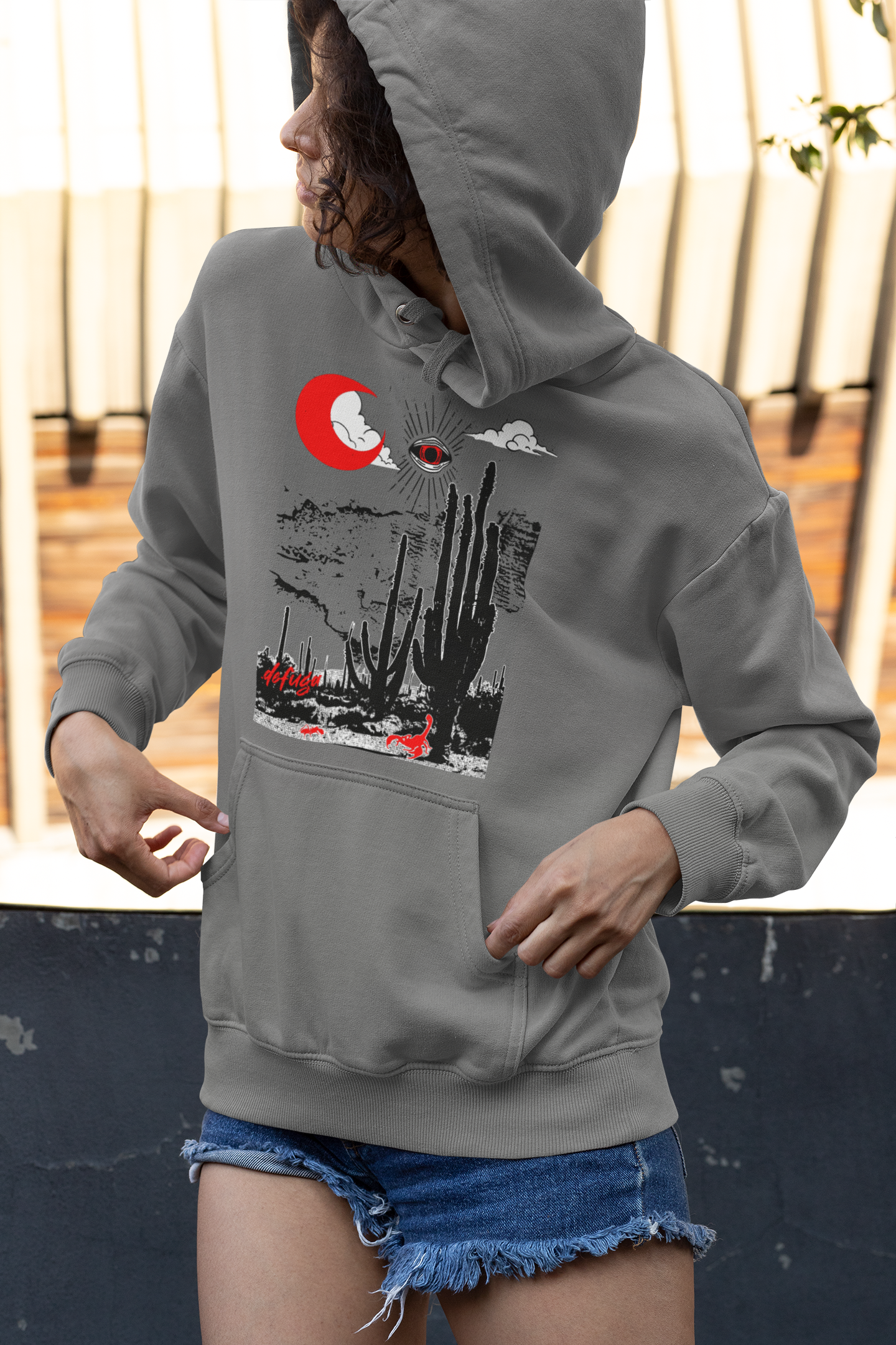 Show off your unique style with our Desert Standoff Hoodie! Made from 100% Ringspun cotton, this soft style hoodie features a handmade print from our Defuga collection. A mystique desert standoff between an ant and a scorpion is captured in this black magic design. Don't settle for basic, stand out with our Desert Standoff Hoodie.