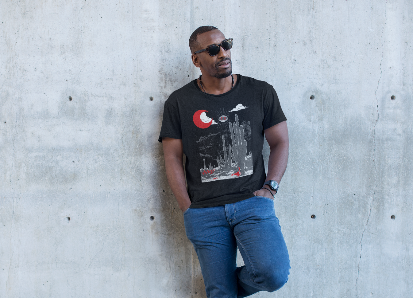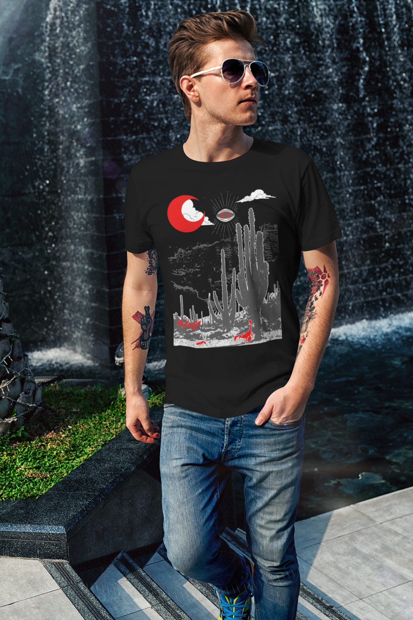 Show off your unique style with our Desert Standoff T-Shirt! Made from 100% Ringspun cotton, this soft style shirt features a handmade print from our Defuga collection. The mystique desert standoff between an ant and a scorpion is captured in this black magic design. Don't settle for basic, stand out with our Desert Standoff T-Shirt.